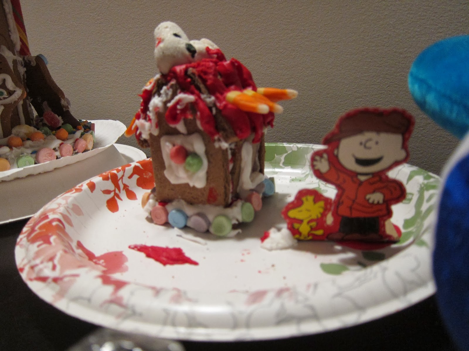 On Christmas Day we decorate gingerbread houses with the cousins. This year I found Snoopy doghouses complete with Snoopy marshmallow and cardboard character cutouts for the kids.